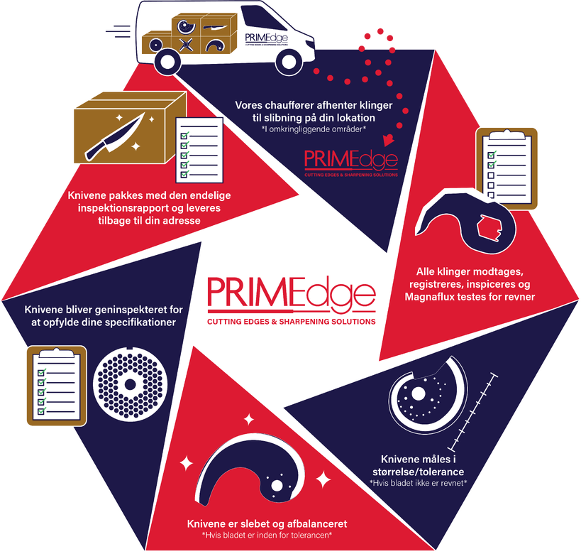 Hos PRIMEdge har vi vist kunsten i at slibe i over fire generationer og hjulpet fødevareproducenter over hele verden med at opnå det bedste resultat, længere levetid for knivene og større effektivitet. Vores omfattende slibeservices går langt ud over at genskabe en skær – vi inspicerer hvert knivblad for spændingsbrud, afbalancerer dem præcist for at eliminere vibrationer og tilbyder avancerede muligheder som specialfremstillet emballage og Teflon®-belægning. Resultatet er skarpere, sikrere og mere holdbare knive, der holder din produktion kørende problemfrit og dine produkter ser bedst muligt ud.