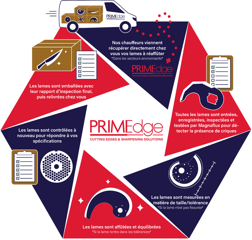 Chez PRIMEdge, nous perfectionnons l'art de l'affûtage depuis plus de quatre générations, aidant les transformateurs alimentaires du monde entier à obtenir des coupes plus nettes, une durée de vie des lames plus longue et une efficacité accrue. Nos services d'affûtage complets vont bien au-delà de la restauration d'un tranchant : nous inspectons chaque lame pour détecter les fissures de contrainte, les équilibrons avec précision pour éliminer toute vibration et proposons des options avancées comme l'emballage personnalisé et le revêtement Téflon®.