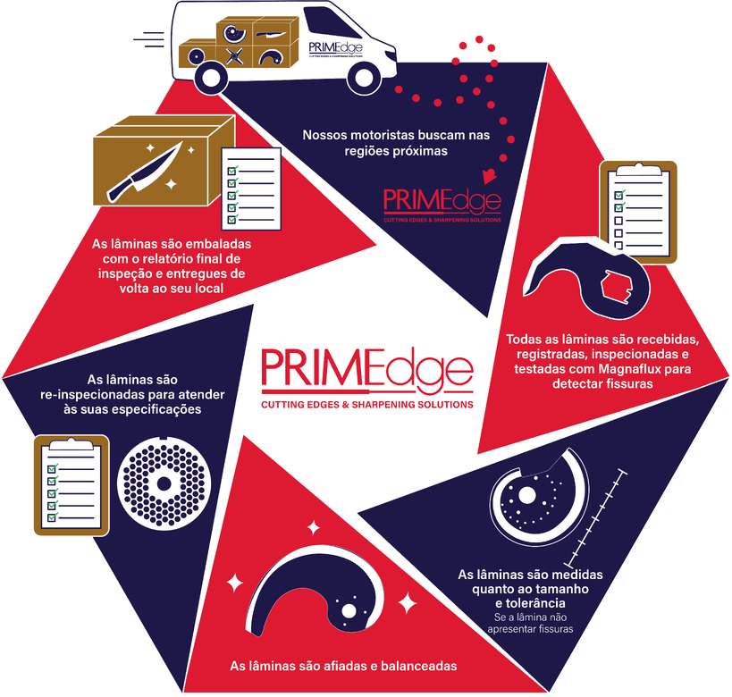 Na PRIMEdge, temos aperfeiçoado a arte do adiamento por mais de quatro gerações, ajudando processadores de alimentos ao redor do mundo a obter cortes mais precisos, maior vida útil das lâminas e maior eficiência. Nossos serviços de afiação abrangem muito mais do que apenas restaurar o fio — inspecionamos cada lâmina em busca de imperfeições por uso contínuo, equilibramos com precisão para eliminar qualquer vibração e oferecemos opções avançadas como embalagem personalizada e revestimento em Teflon®. O resultado são lâminas mais afiadas, seguras e duradouras que mantêm suas operações funcionando sem problemas e seus produtos com a melhor aparência.